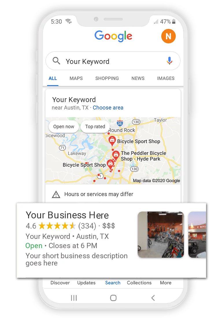 Your Google Business Profile will be optimized for your targeted search phrases and local market. The GBP optimization service includes the following: